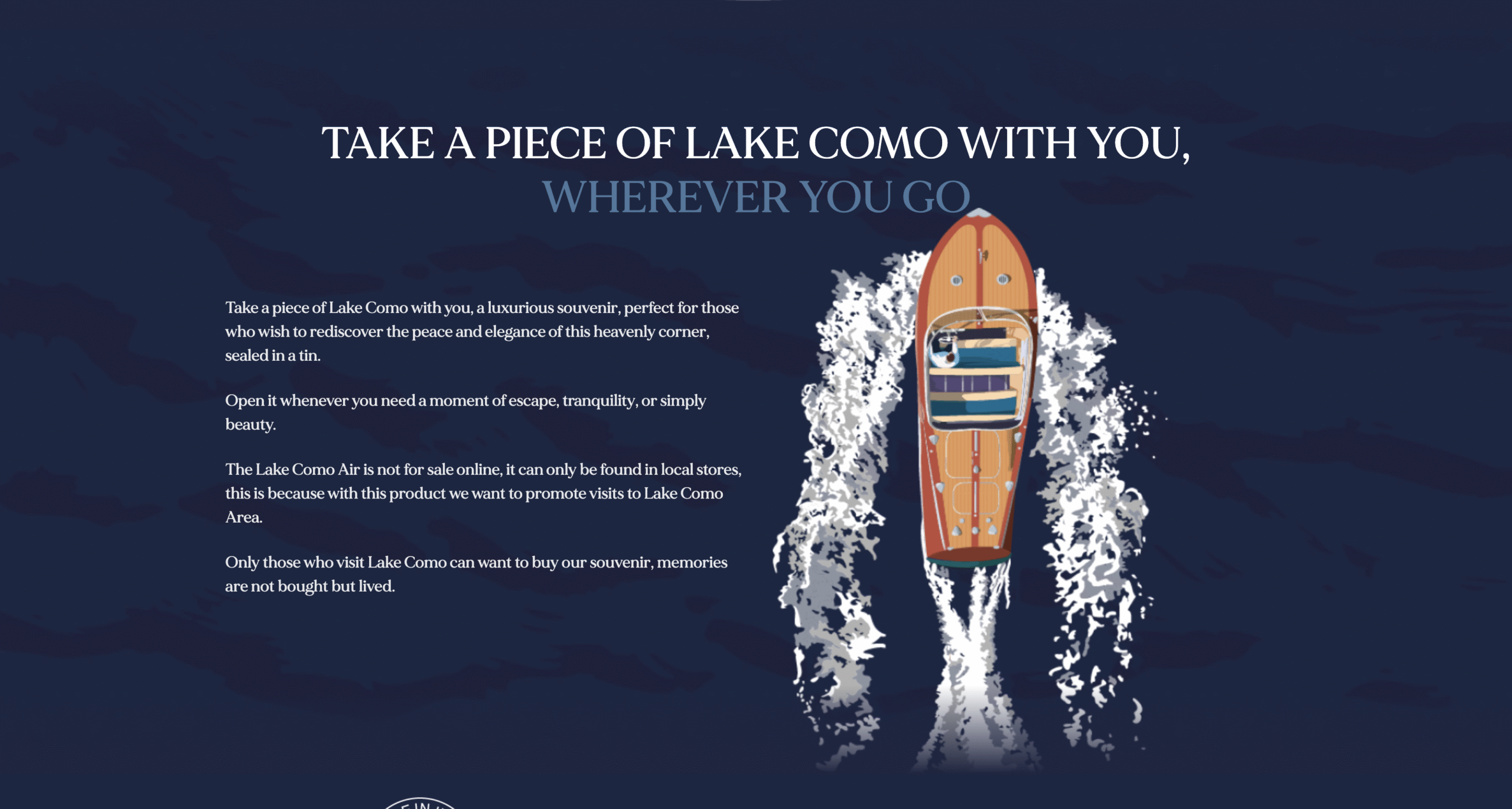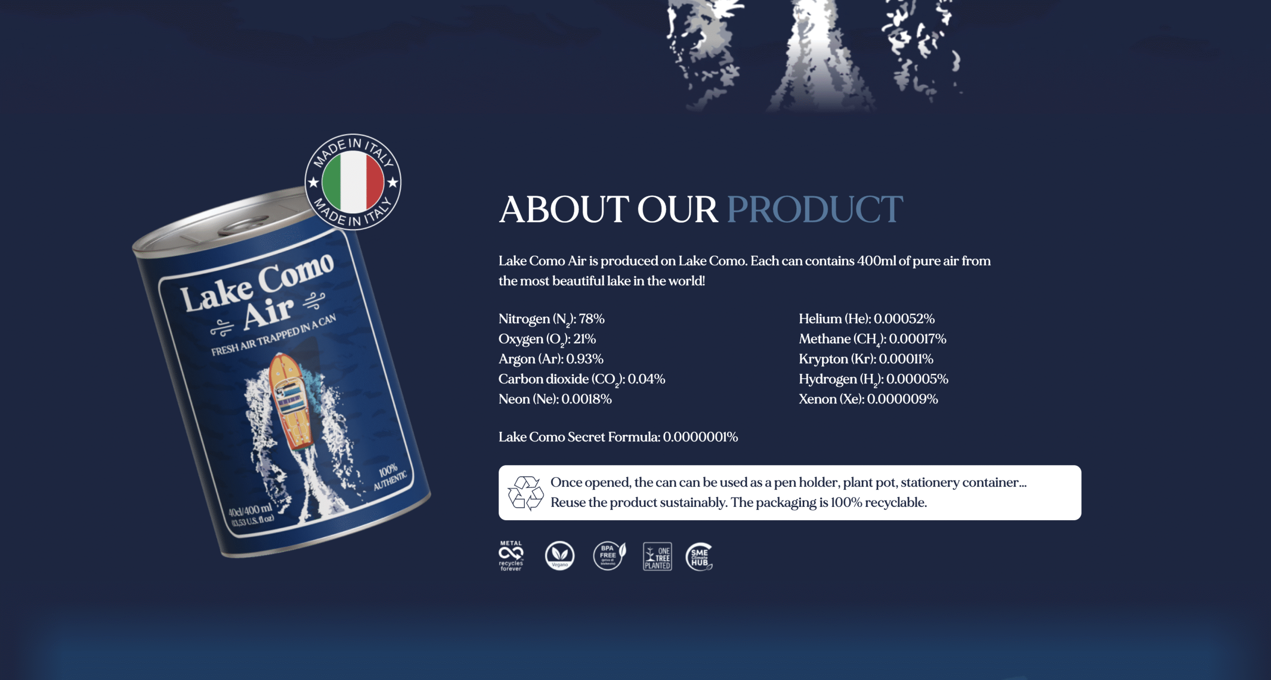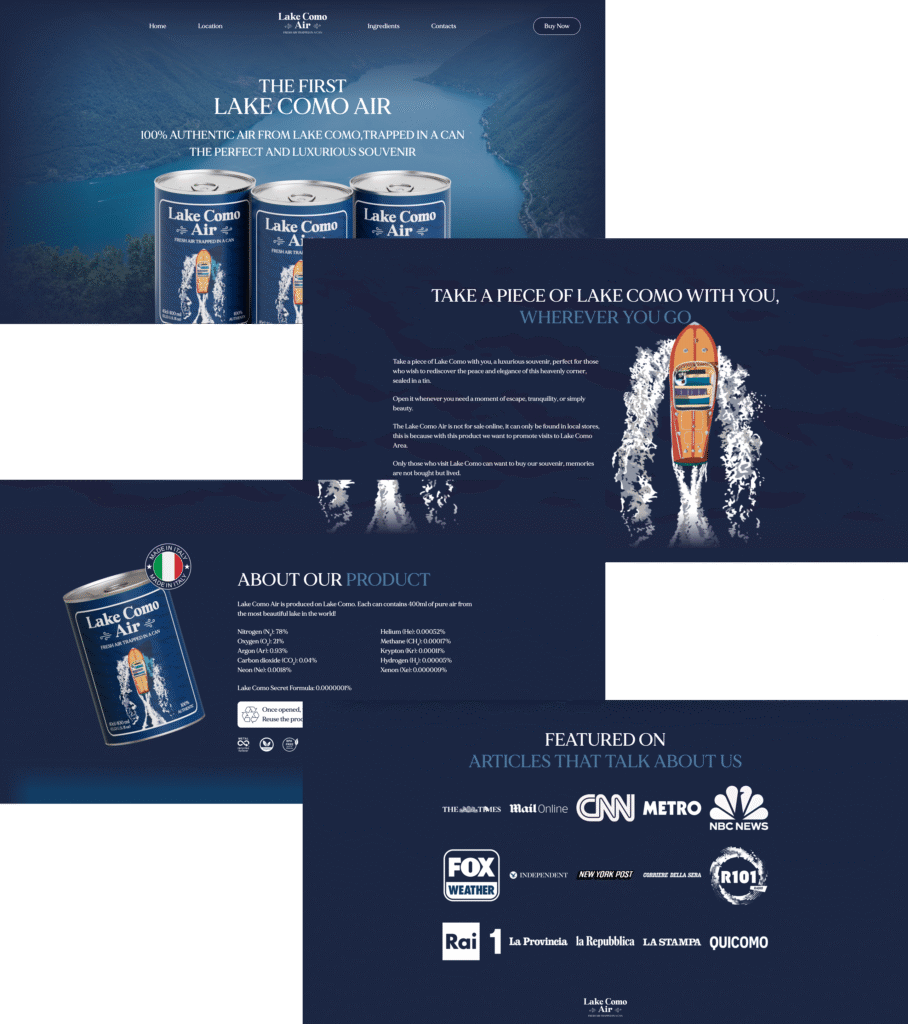 Sviluppo del design del sito ufficiale di Lake Como Air, originale souvenir in lattina, venduto in negozi selezionati come ricordo sostenibile e unico.
