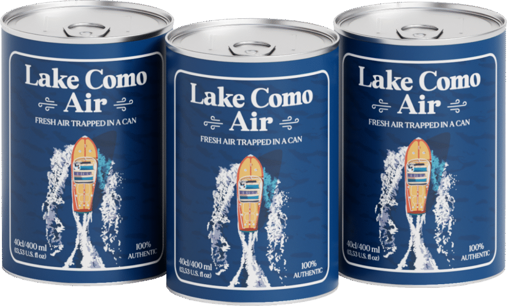 Lake Como Air è un barattolo contenente l’aria del Lago di Como. Nato come un souvenir provocatorio, è diventato un fenomeno nazionale ed internazionale, tanto da essere citato dalla CNN, BBC, Times, NBC News, Rai1, Corriere della Sera.