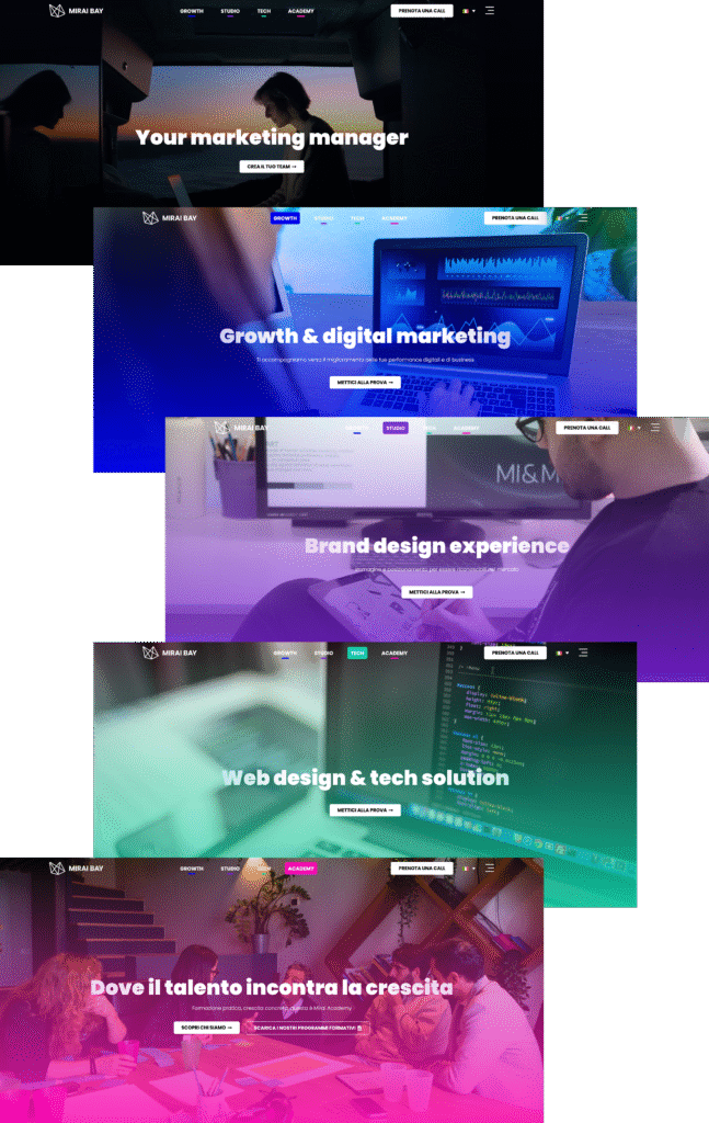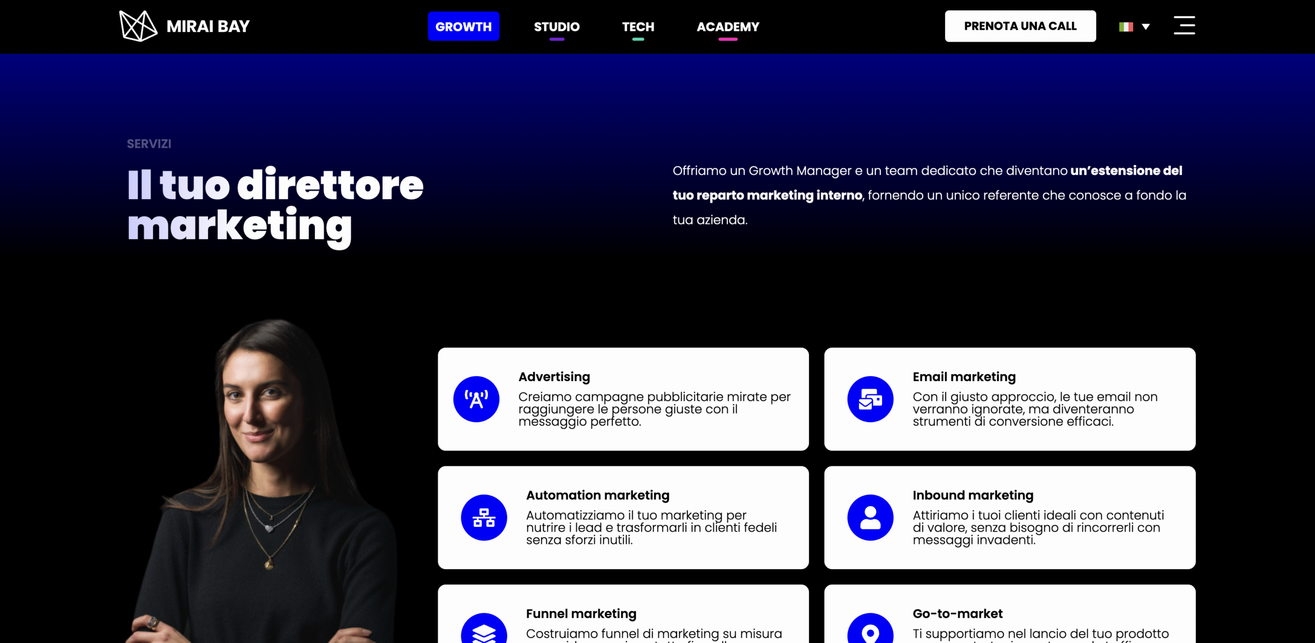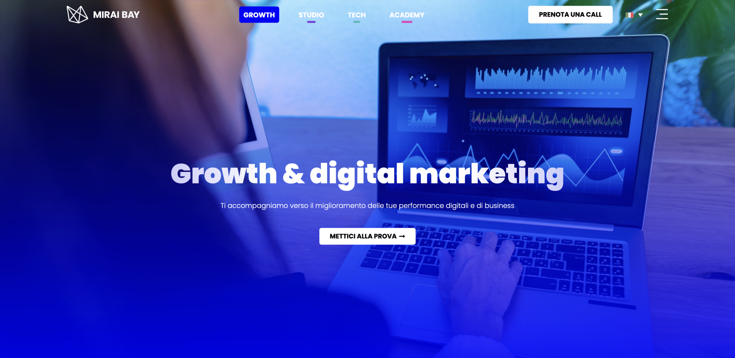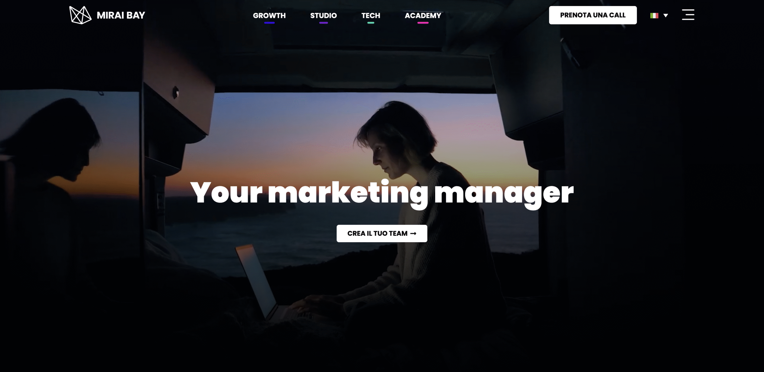 Mirai Bay è un’agenzia di marketing digitale che si distingue per l’adozione di strategie innovative e data-driven, focalizzandosi sulla crescita rapida e sostenibile dei propri clienti. L’agenzia offre un servizio completo, fungendo da reparto marketing esterno per le aziende, e integra competenze in growth hacking, sviluppo tecnologico e creazione di contenuti .