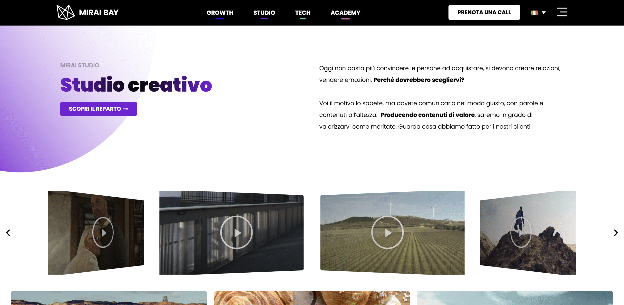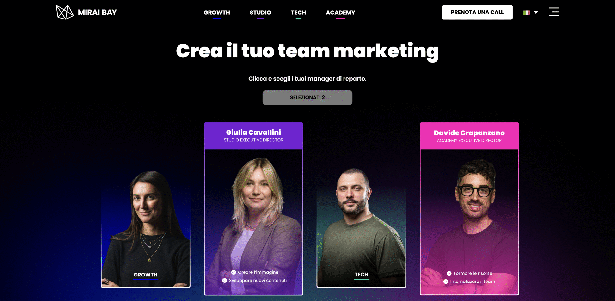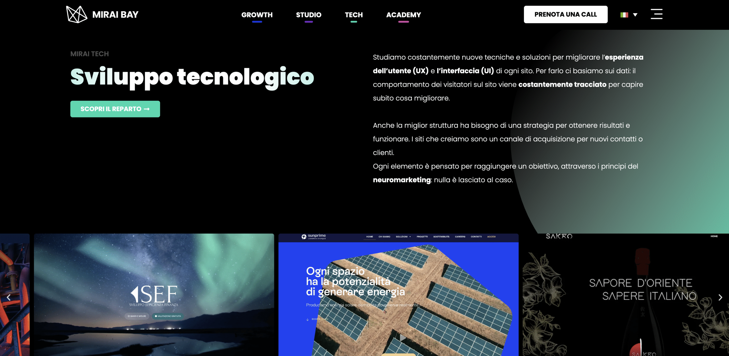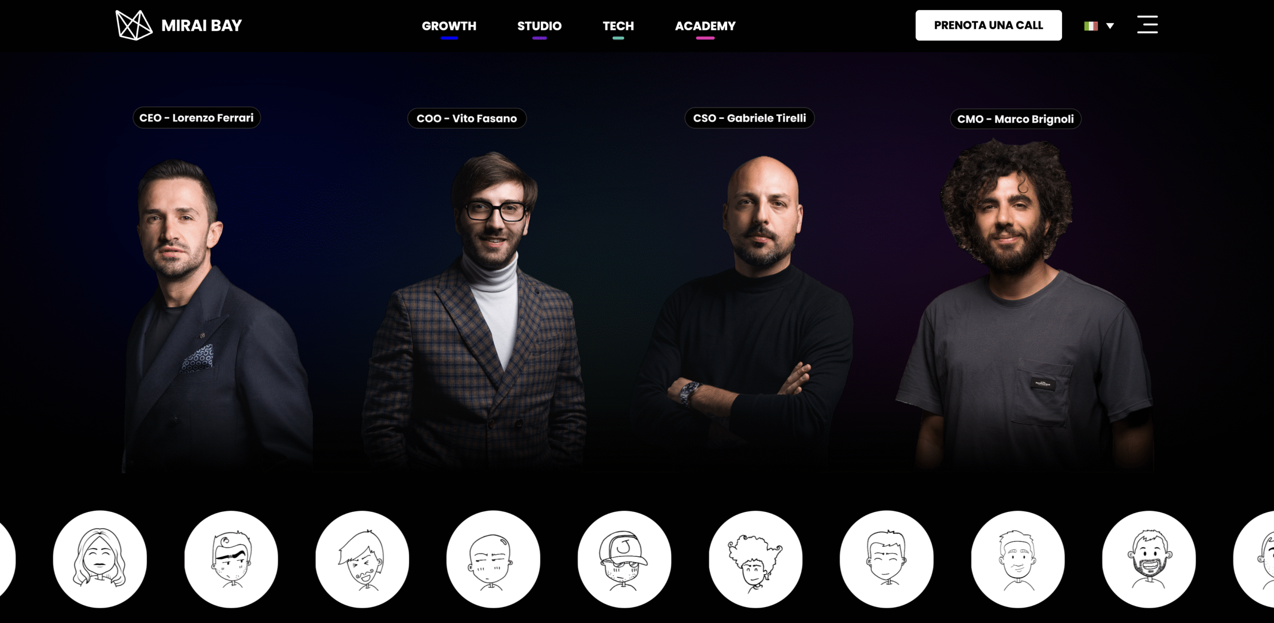 Mirai Bay è un’agenzia di marketing digitale che si distingue per l’adozione di strategie innovative e data-driven, focalizzandosi sulla crescita rapida e sostenibile dei propri clienti. L’agenzia offre un servizio completo, fungendo da reparto marketing esterno per le aziende, e integra competenze in growth hacking, sviluppo tecnologico e creazione di contenuti .