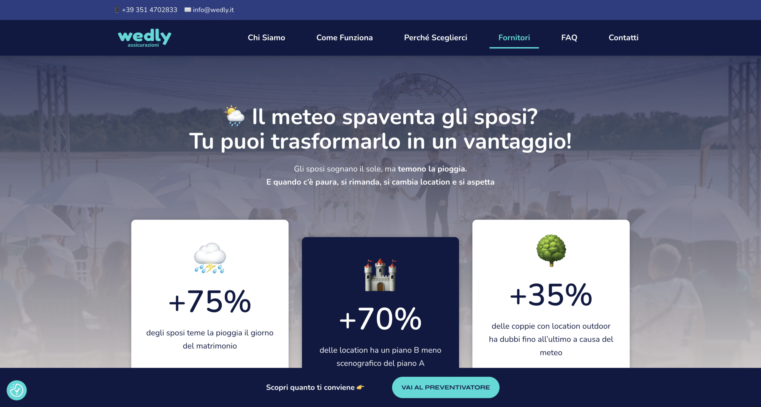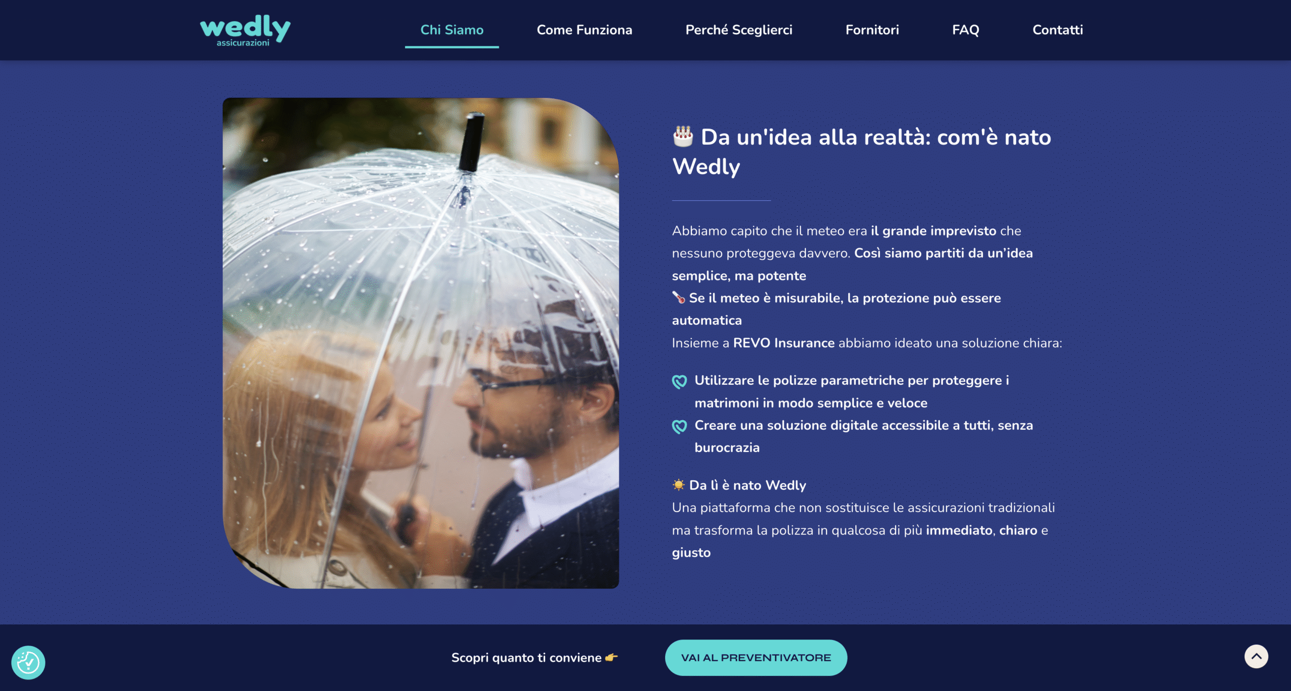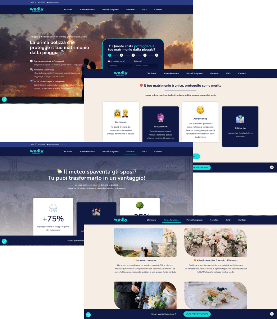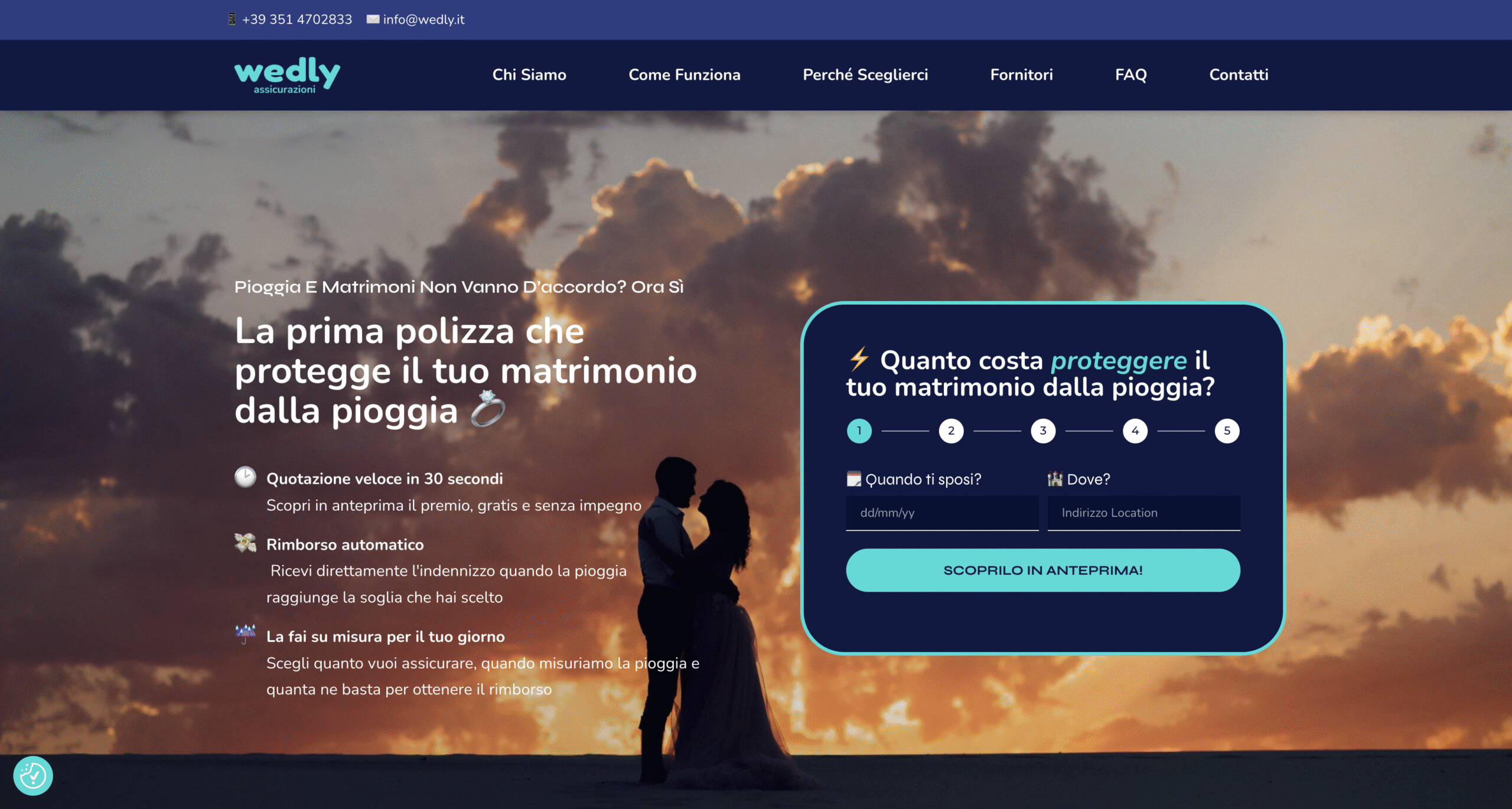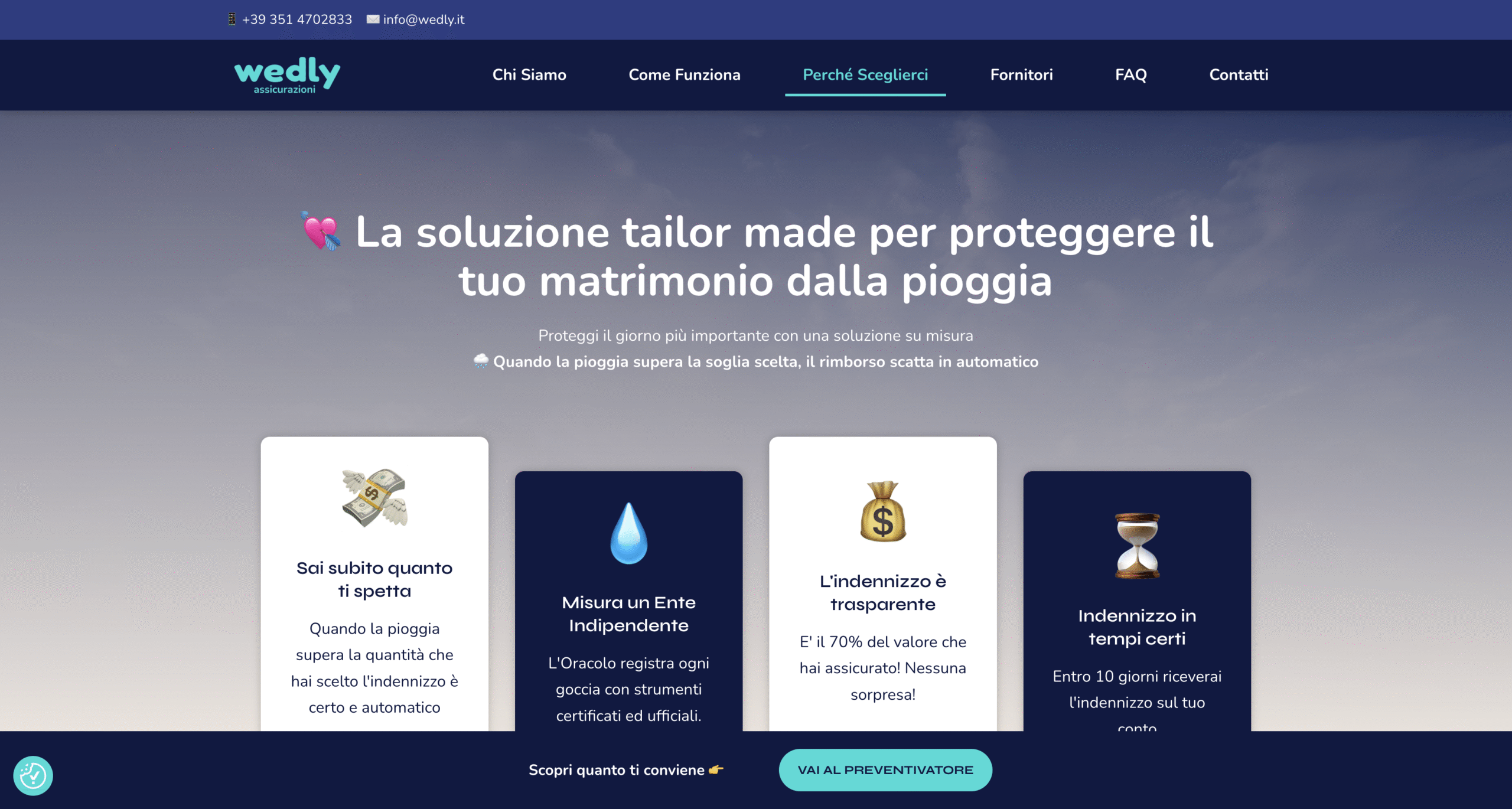 Sviluppo in WordPress di un sito per un’agenzia che si occupa di polizze e di rimborsi in caso di pioggia durante i matrimoni.